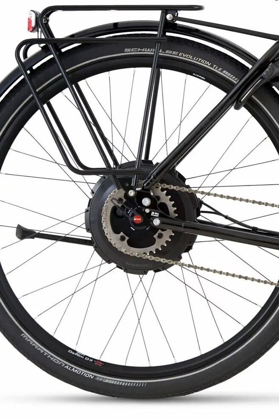 Beim Heckantrieb befindet sich der Elektromotor in der Hinterradnabe. Es gibt sowohl Direktläufer als auch Modelle mit internem Getriebe. Sie sind sehr leise und auch in ruhiger Umgebung kaum zu hören.